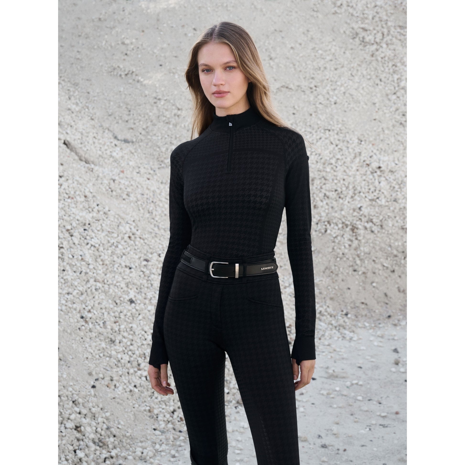 Full-seat houndstooth print silicone offers grip for stability and security in the saddle. The LeMieux branded lower leg is laser cut to reduce bulk under boots.