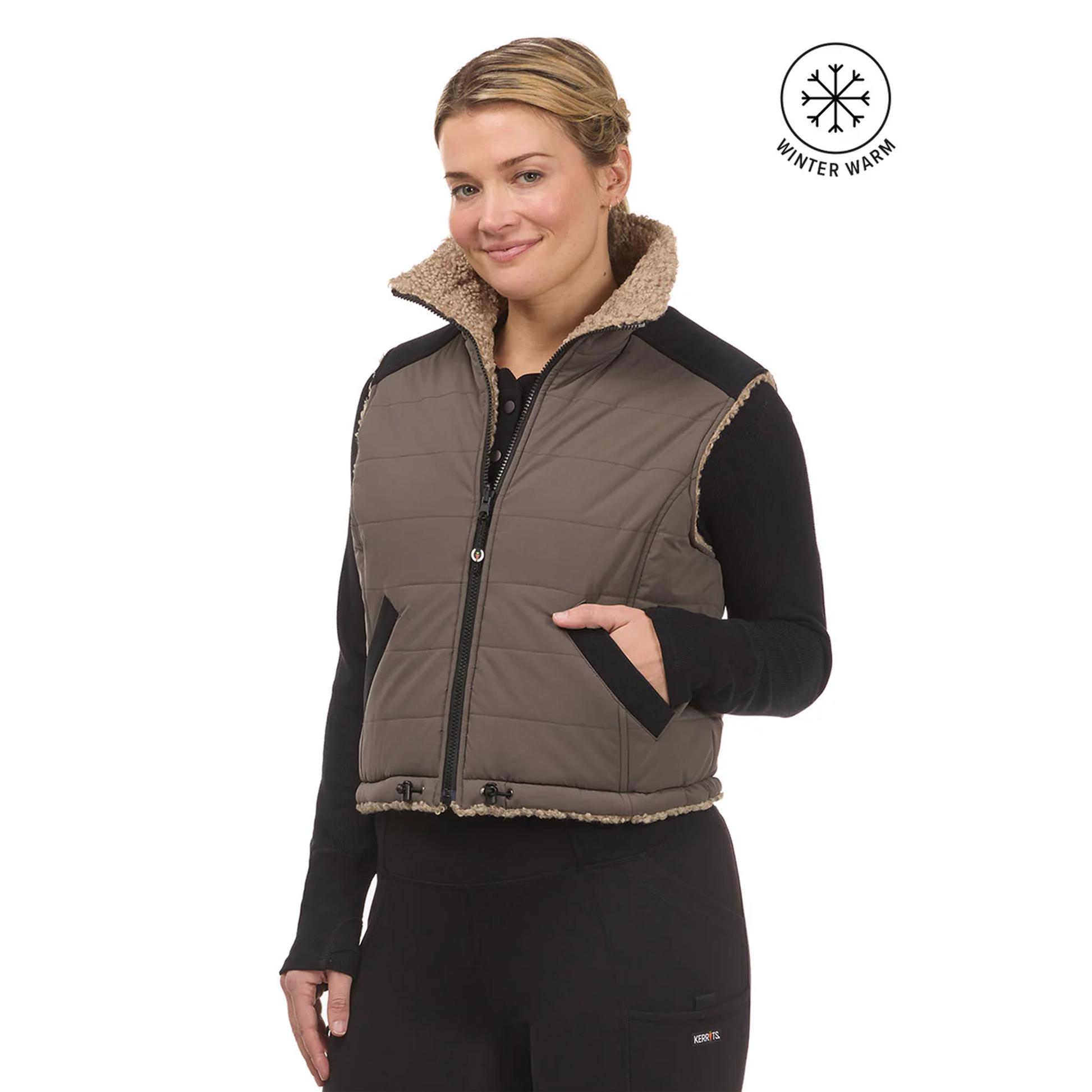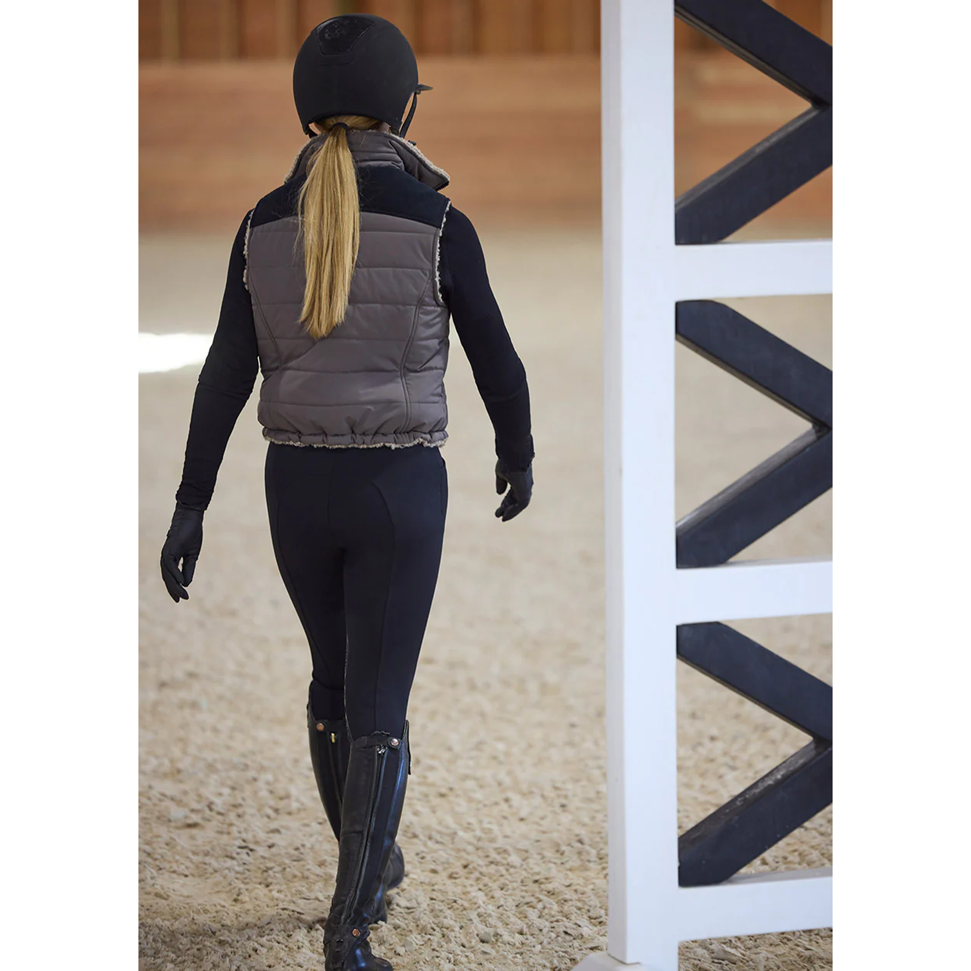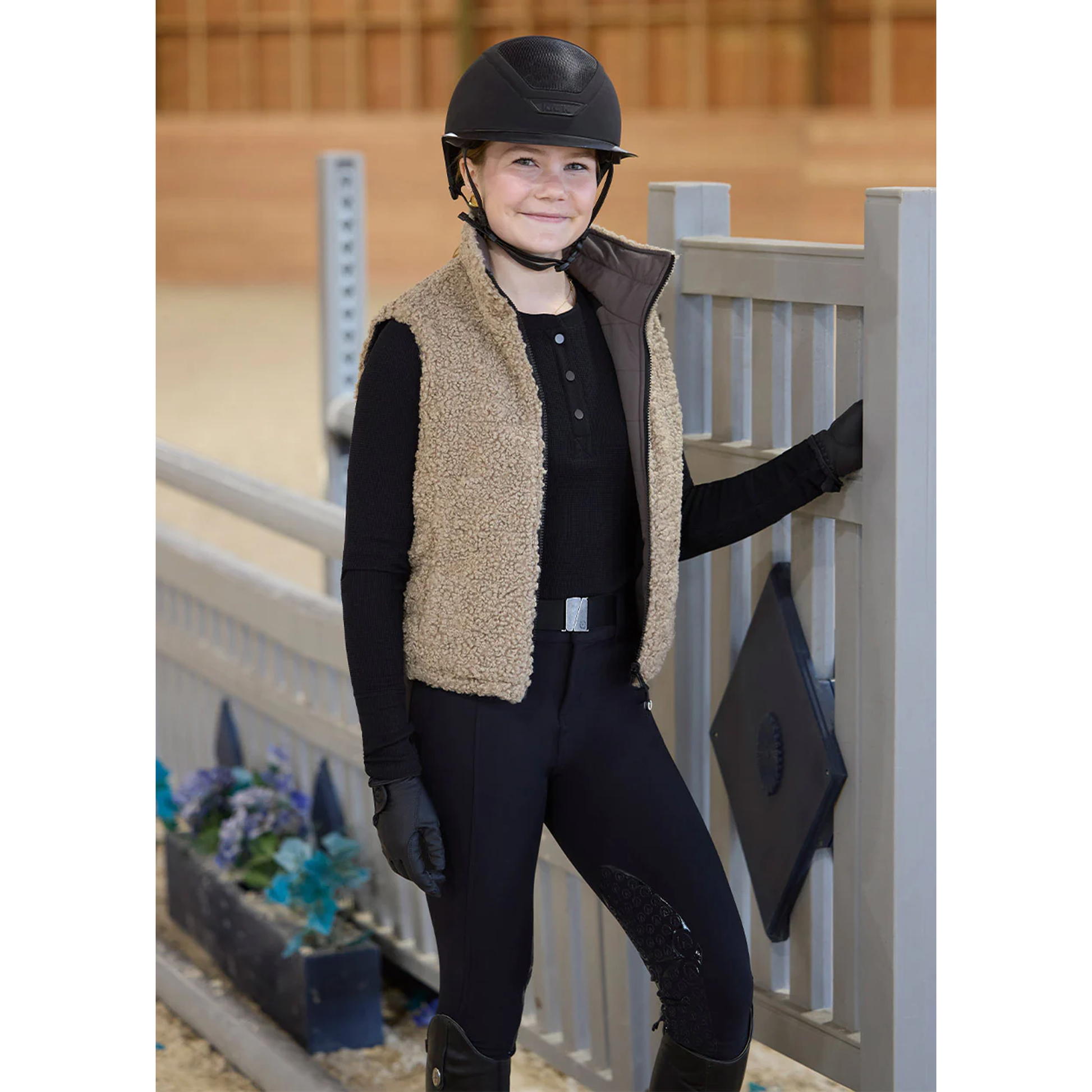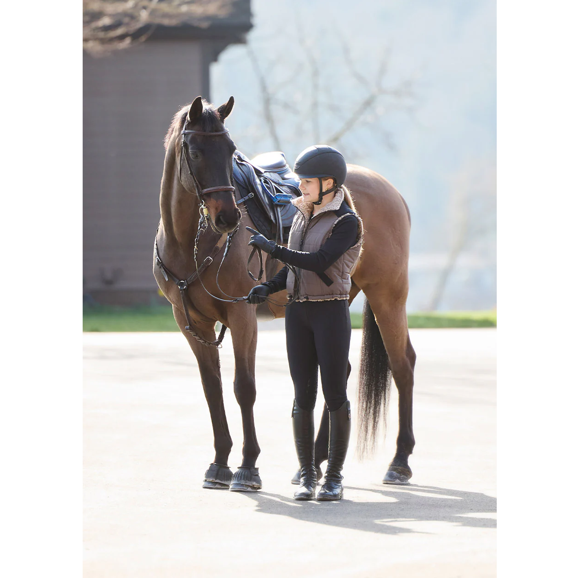 Kick up your riding wardrobe with this reversible, cropped vest—offering two stylish looks in one. One side features classic smooth canvas; the other, cozy sherpa fleece, quilted together with 140g poly-loft fill for core warmth. A tall collar, adjustable drawcord waist, and dual-sided pockets blend comfort and function with modern equestrian flair.