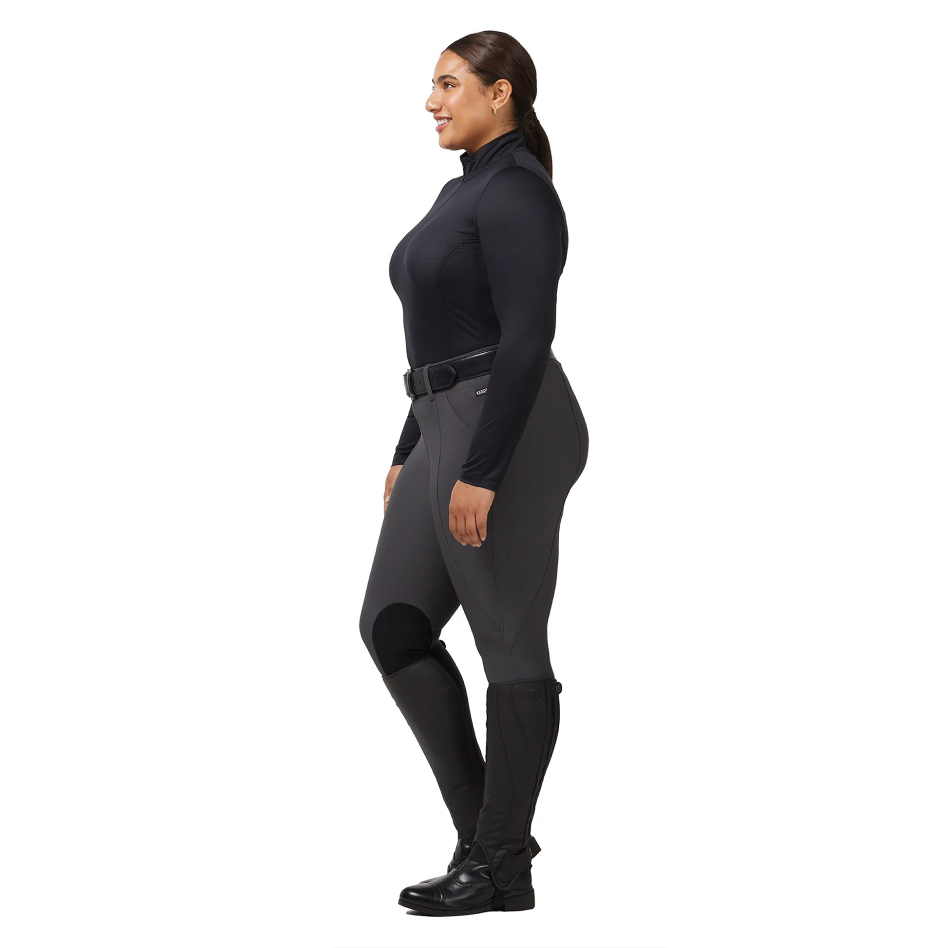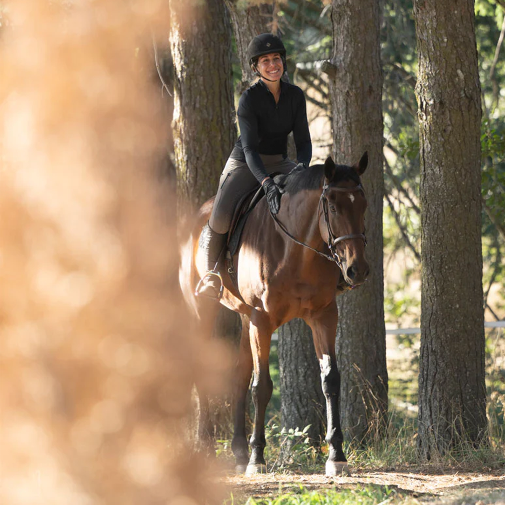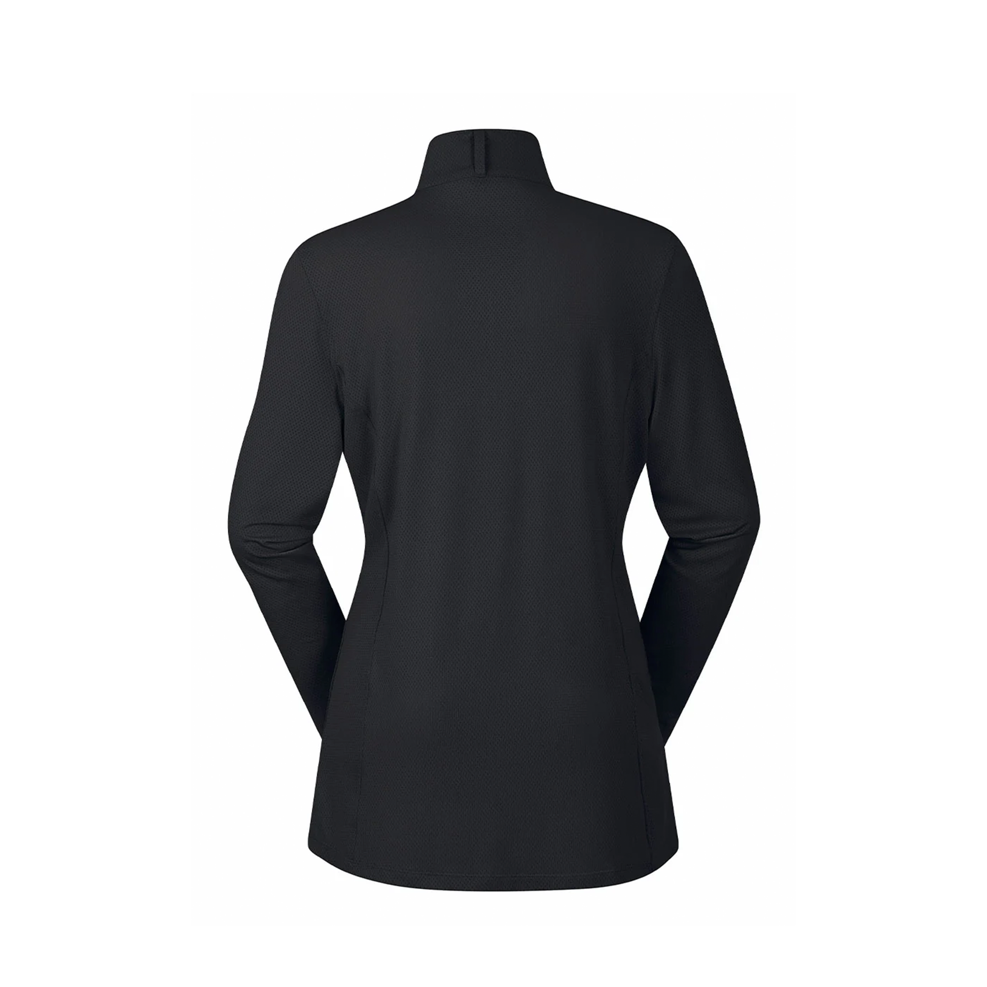 Wear it as a base layer top or on its own, the featherlight fabric provides UPF+30 sun protection and stretches with every move, while the Ice Fil® in this long sleeve shirt keeps riders cool by lowering skin’s surface temp up to five degrees. Ten-inch zip collar adds additional ventilation while the sporty, feminine fit, and equestrian hem flatter.