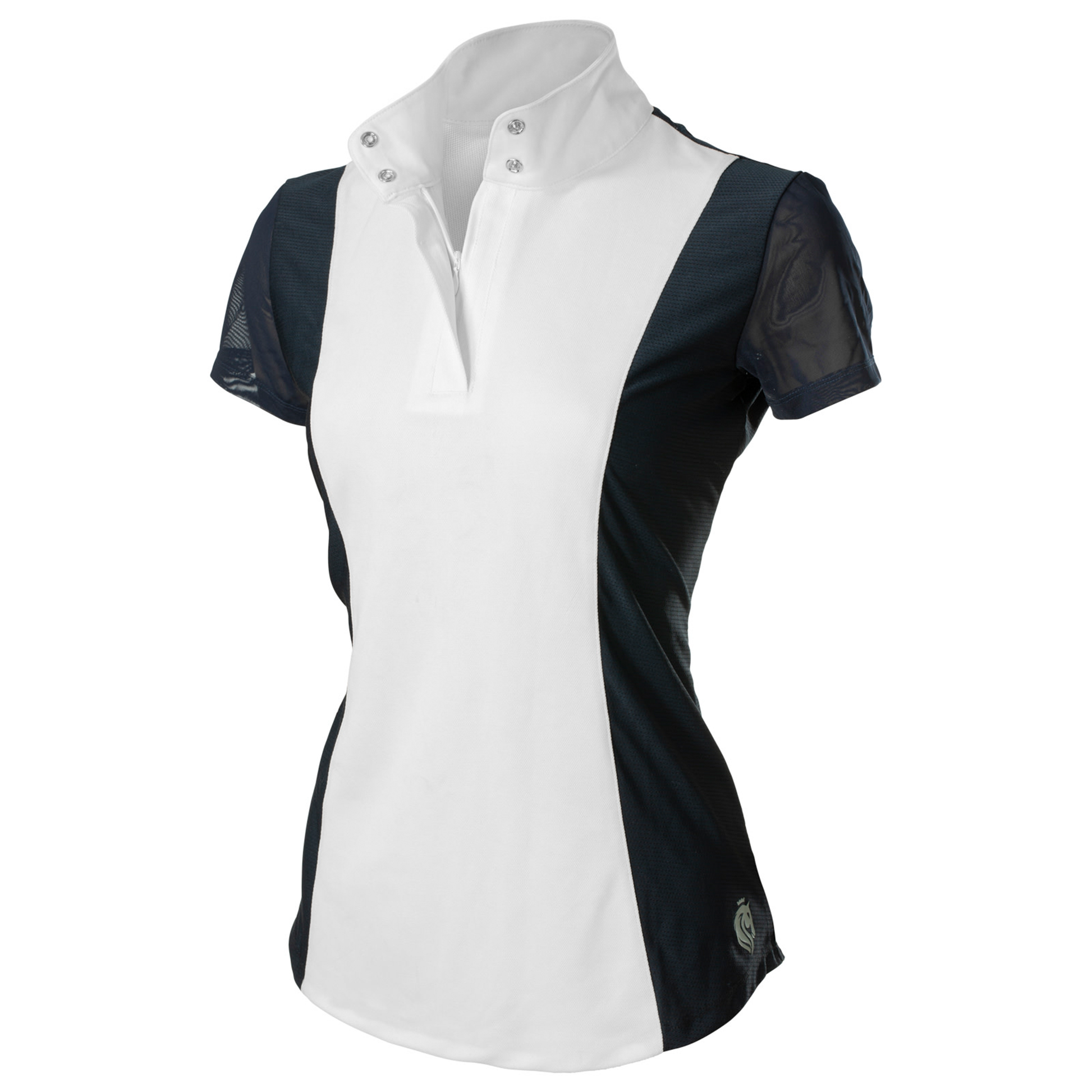 The Martha Short Sleeved Shirt is thoughtfully designed for riders seeking both style and comfort, especially when competing in the show ring. Made with a lightweight and breathable perforated mesh back, this shirt ensures optimal ventilation, keeping you cool during intense rides. The front, cuffs, and collar are crafted from solid white fabric to maintain a traditional, polished look when worn under a show coat. A fitted silhouette with a contoured hem provides a flattering, tailored appearance. The shirt's pull-on cuffs eliminate the hassle of dealing with buttons or snaps while wearing riding gloves. With a discreet half-inch zipper placket and hidden snap collar, the shirt remains sleek and professional. A stock tie loop at the back adds a thoughtful detail for easy stock tie attachment.